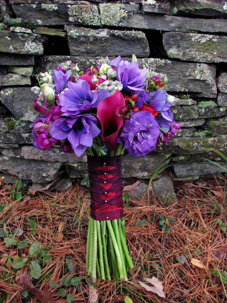 In the Brides Bouquet we used dark red Ranunculus, rust Roses, green/burgundy Hydrangea, burgundy Dahlia’s, Lady’s Mantle, purple Anemones, dark burgundy Calla Lilies, Cherry Brandy Roses, ivory Stock, two sizes of Brunia and lots of branch. Even the stems of the bouquet were wrapped with branch. I think this was really interesting and cool.